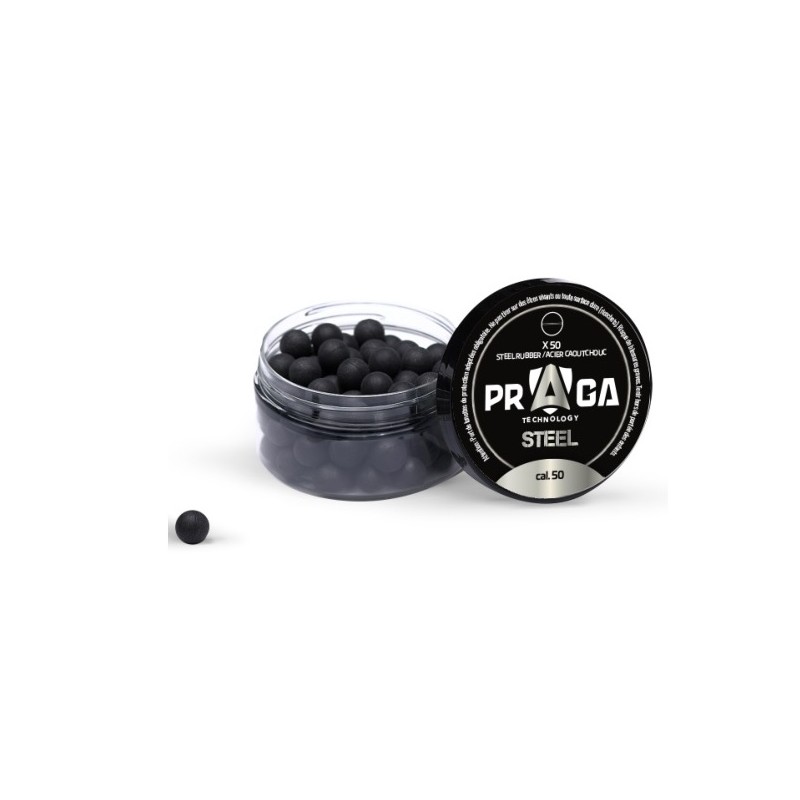 Défendez vous avec ces billes caoutchouc et particules métal de calibre .50 (en pot de 50 billes) de la marque Praga technology.