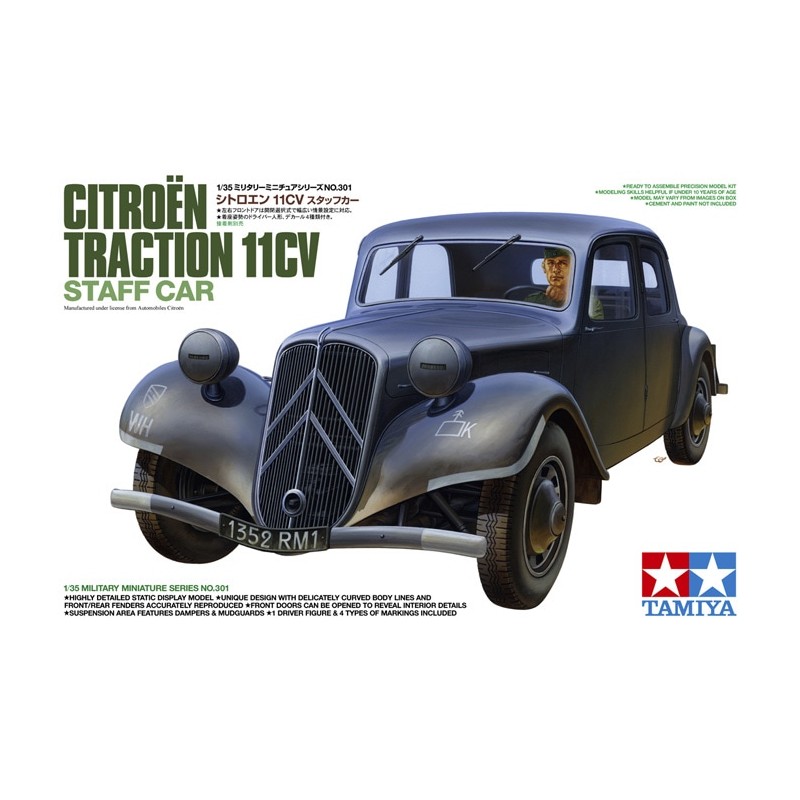 Kit d’assemblage de modèle en plastique à l’échelle 1/35 de la voiture personnelle 11CV. ★ Longueur : 125 mm, Largeur : 48 mm. Les lignes de carrosserie délicatement courbées et les ailes avant et arrière gracieuses ont été richement reproduites. ★ Les portes avant peuvent être ouvertes pour s’adapter à un large éventail de situations de diorama. ★ L’intérieur, y compris le tableau de bord ainsi que les sièges avant et arrière, présentent des détails de moulages fins. ★ La zone de suspension présente des amortisseurs et des gardes-boues. ★ 1 figurine de conducteur assis est incluse. ★ 4 types de marquages pour représenter la Wehrmacht (2), l’armée française ou les véhicules civils inclus.