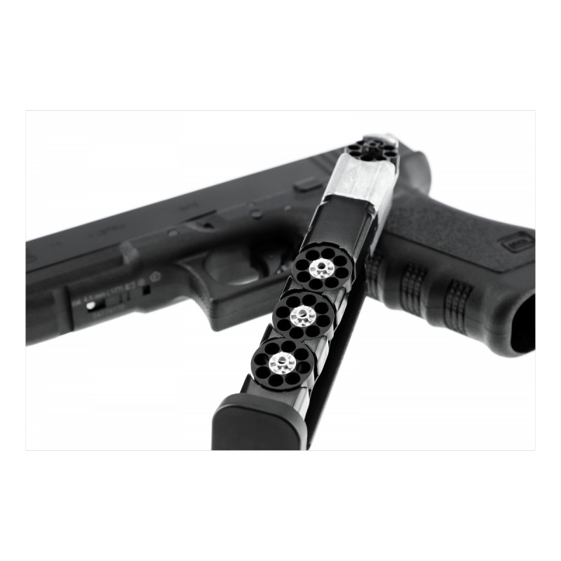 Le chargeur tout-en-un intègre quatre barillets rotatifs de 8 coups chacun ainsi qu'une cartouche de CO2de 12 g. Cette version peut tirer aussi bien des billes acier que des plombs diabolos.