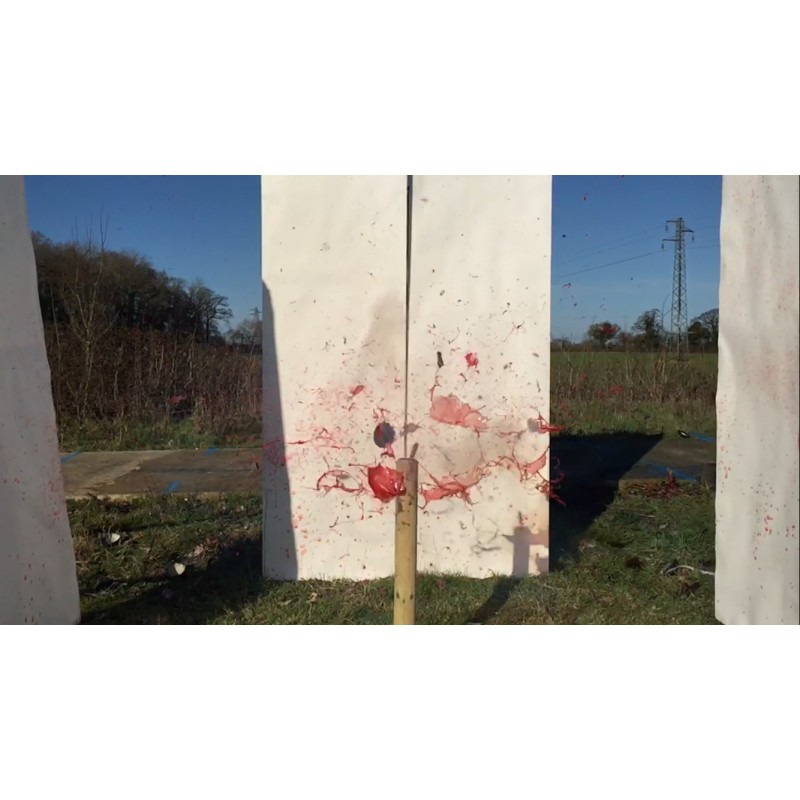 La charge est constituée de 100 ml de peinture rouge épaisse.