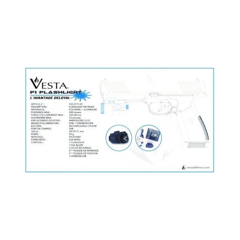 Votre magasin DR6 vous propose, dans sa gamme airsoft, cette lampe tactique stroboscope (puissance : 500 lumens) de la marque Vesta defense.